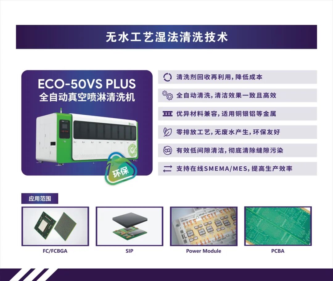 在展会上,公海555000光电重点展示了湿法清洗设备的最新成果及公司明星产品 ECO-50VS PLUS全自动真空喷淋清洗机。其中ECO-50VS PLUS采用“零废水排放”和“无水清洗工艺”,可高效去除助焊剂残留和微小颗粒,避免传统水洗对敏感元件的潜在损伤;封闭循环系统可回收清洗剂,大幅降低运营成本。